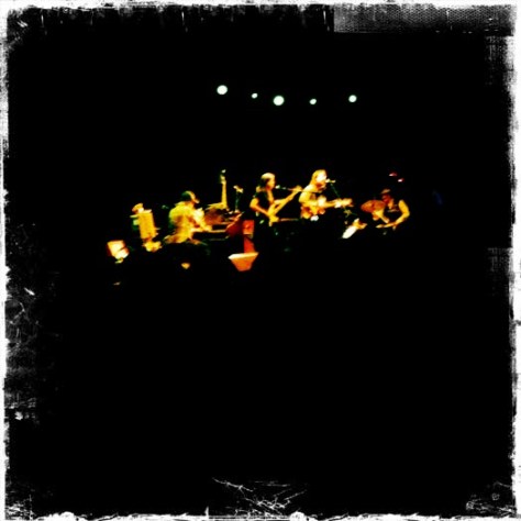 The gig was in Vicar Street, having been moved from Whelan’s due to a large demand for tickets. The whole ground floor of Vicar Street was packed with 20s/30s cool people and older cool people. There were beards and checked shirts in abundance. We had our customary Jameson & Cokes in the bar. I thought it was more of a longneck beer night, but Brian has a predilection for that particular combo which wouldn’t be staved off and I joined him for auld lang syne. It’s a while since we saw each other and so we managed to miss the support act but we wandered into the main venue shortly after nine and contemplated where it would be best to stand. Having found the perfect spot that managed to suit our very different physicalities, we awaited the band’s arrival on stage. Tom Waits played over the PA system…